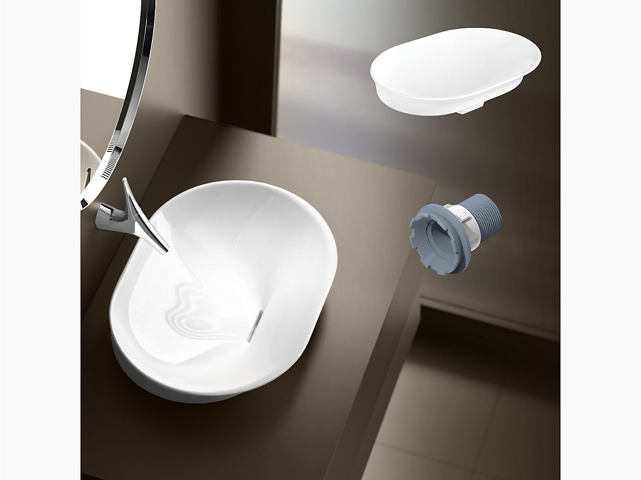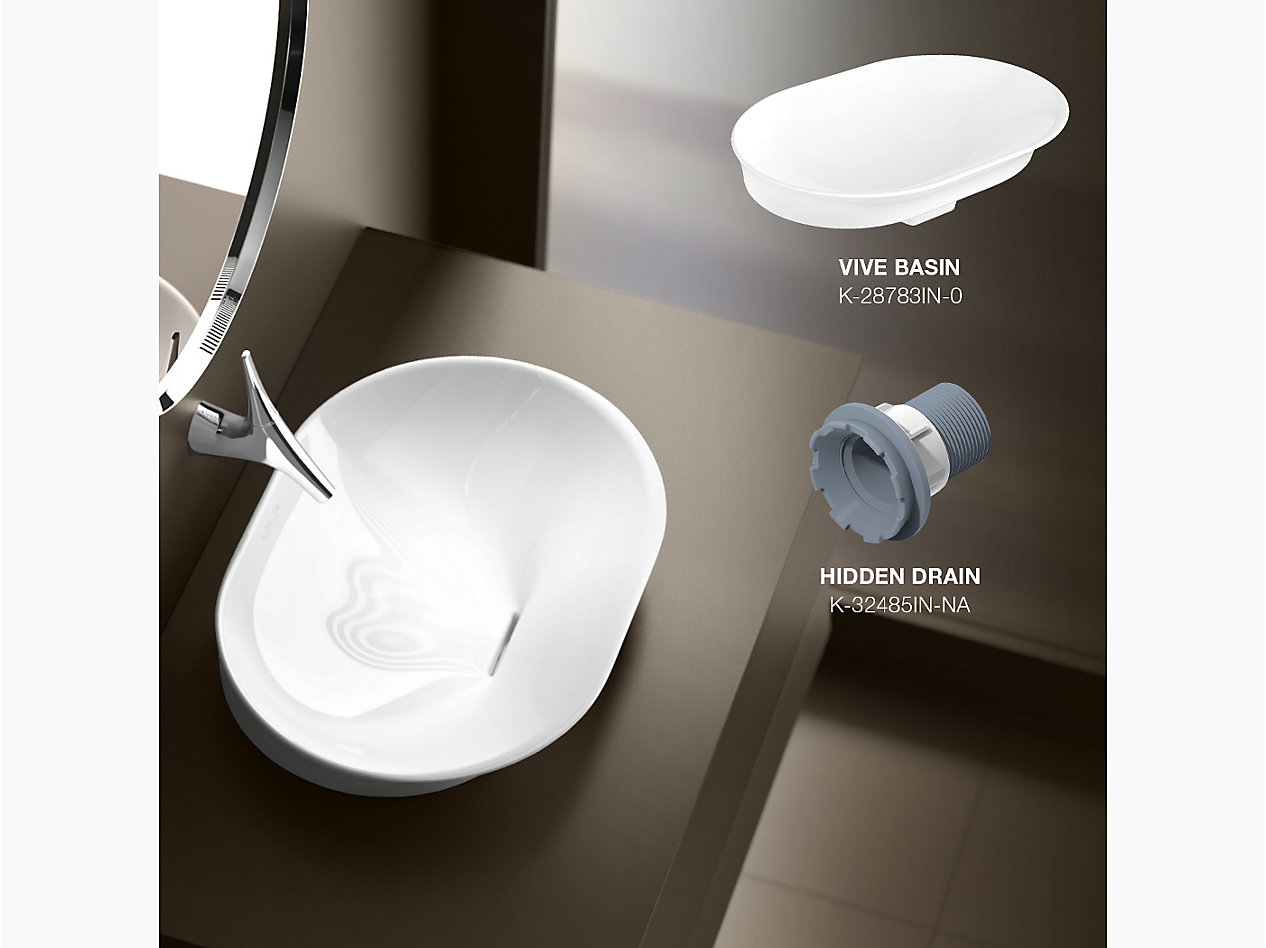 Secure with silicone sealant on flat countertop; align drain with pre-cut hole (template included). Pair with Kohler Vive wall-mount faucet for cohesive look. Professional plumbing advised for hidden drain alignment.